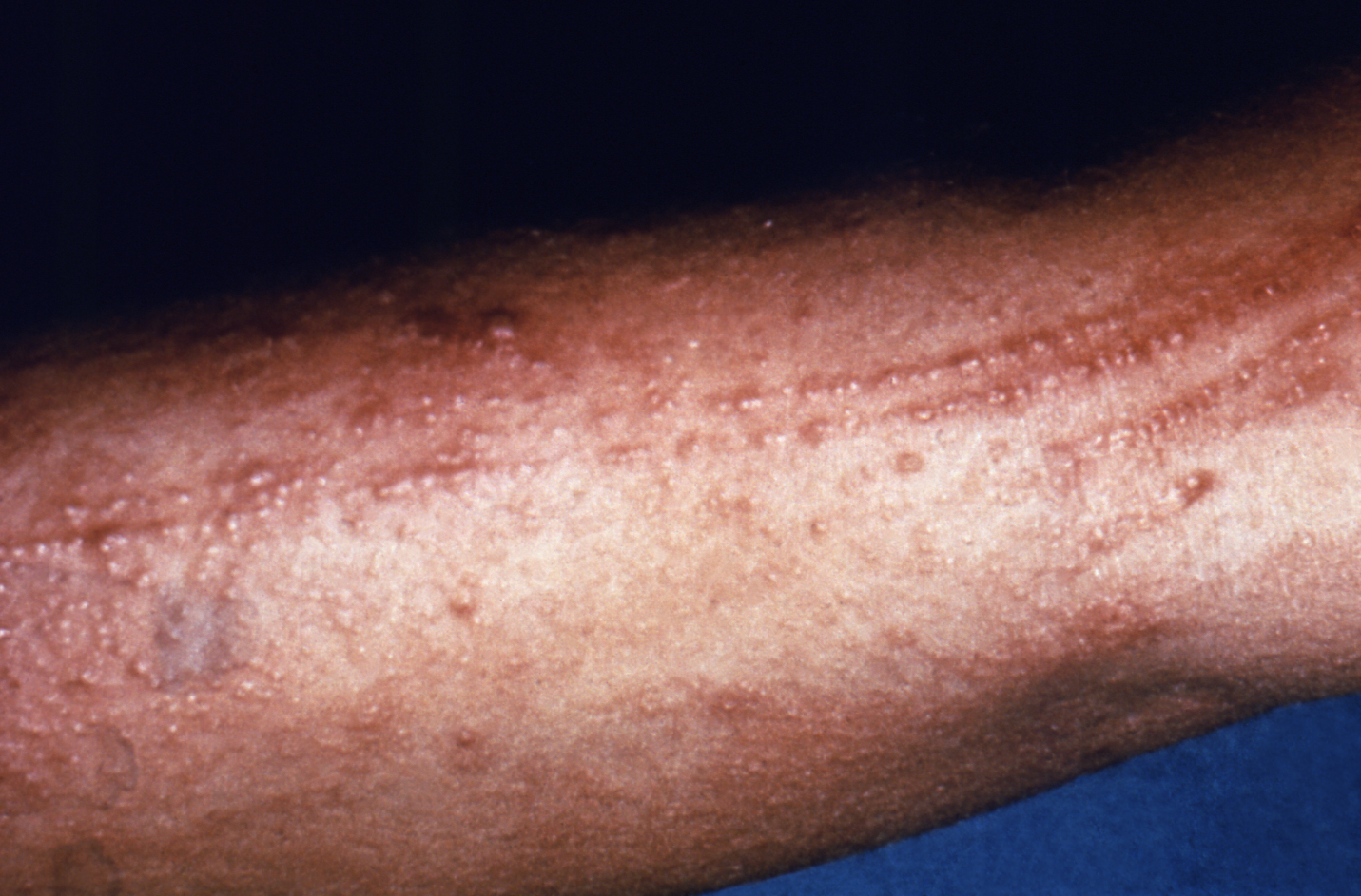 Five-year-old Caucasian, male presents with a vesicular, pruritic rash similar to the pic above. 24-48 hours previously he helped his grandfather move cattle from one pasture to another. He attended a swim party later that evening. No one from the swim party was sick or had rash. Child denies insect or bee sting. The rash is worse when child is hot or in tepid bath. The rash is generalized over body surface in exposed areas.