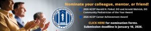 The American College of Osteopathic Pediatricians (ACOP) is accepting nominations for the 2026 Harold H. Finkel, DO and Arnold Melnick, DO Community Pediatrician of the Year Award and the 2026 Career Achievement Award.
